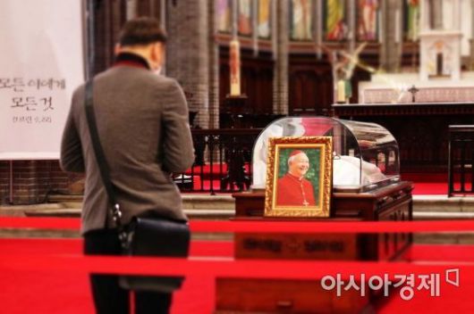 천주교 서울대교구장을 지낸 정진석 추기경이 향년 90세를 일기로 선종한 28일 시신이 안치된 서울 중구 명동성당 대성전에서 조문객들이 조문을 하고 있다./사진제공=천주교서울대교구 |