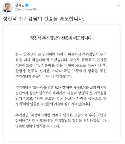 문 대통령은 "참으로 온화하고 인자한 어른이셨다"고 정 추기경을 떠올린 뒤 "서른아홉 젊은 나이에 주교로 서품되신 후, 한평생 천주교 신자뿐 아니라 국민 모두에게 평화를 주신 추기경님의 선종이 너무나 안타깝다"고 아쉬워했다.