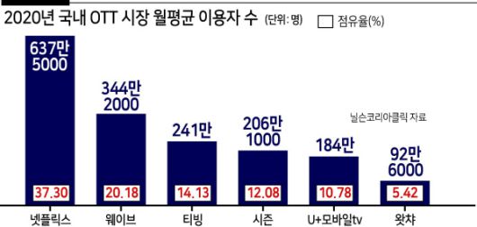 업계 관계자는 “토종 OTT 단독으로 넷플릭스, 디즈니플러스를 대항하기는 역부족”이라며 “토종업체들 간의 다양한 협력 방안들이 논의될 가능성이 있다”고 말했다.
