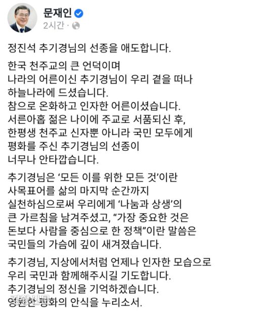 문 대통령은 이날 사회관계망서비스(SNS)에 올린 글에서 “한국 천주교의 큰 언덕이며 나라의 어른이신 추기경님이 우리 곁을 떠나 하늘나라에 드셨다. 참으로 온화하고 인자한 어른이셨다”며 이같이 밝혔다.