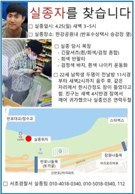 A씨는 이날 오전 3∼5시 반포한강공원 수상택시 승강장 인근에서 마지막으로 목격된 후 연락이 끊겼다.