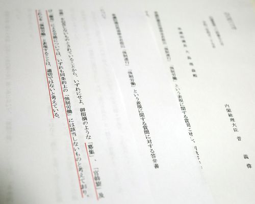 그간 일본 정부는 징용을 비롯한 일제 강점기 노무 동원이 강제 노동이 아니라는 주장을 여러 경로로 펼쳤으나 이를 국회의 질의에 대한 답변서 형태로 각의 결정함으로써 정부 차원에서 공식적으로 강제 노동을 부인하는 단계에 접어들었다.