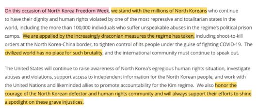 이어 “우리는 또한 탈북자와 인권 사회의 용기에 경의를 표하며, 이런 중대한 불의를 집중조명하려는 그들의 노력을 항상 지지할 것”이라고 강조했다.