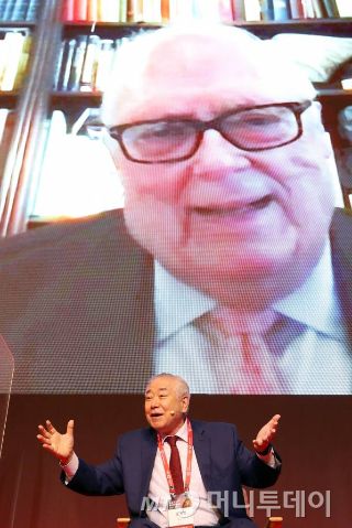 문정인 세종연구소 이사장(아래쪽)과 에드윈 퓰러 해리티지 재단 이사장이 29일 여의도 콘래드 서울에서 열린 머니투데이 주최 '키플랫폼 2021' 총회에서 '어게인 2018: 한반도 평화와 한미동맹의 미래'에 대한 화상 대담을 하고 있다. /사진=이기범 기자. |