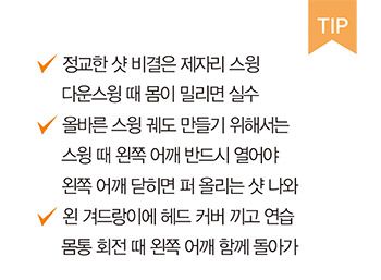그렇다면 ‘제자리 스윙 느낌’은 어떻게 찾으면 될까요. “스윙을 할 때 공을 향해 덤비지 않아야 한다. 머리와 몸이 임팩트 이후에 왼쪽으로 가는 느낌으로 스윙을 하면 제자리 회전의 느낌을 알 수 있다”고 설명하네요. 공을 정교하게 보내야 하기 위해 ‘클럽 헤드’를 잘 던져야 하고 ‘헤드(머리)’는 뒤에 남아 있어줘야 한다는 얘기입니다.