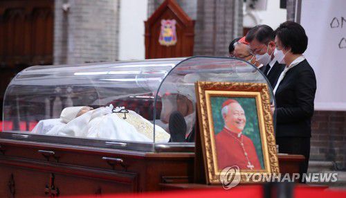 (서울=연합뉴스) 양정우 임형섭 기자 = 문재인 대통령과 김정숙 여사는 29일 오전 서울 명동성당에 마련된 고(故) 정진석 니콜라오 추기경의 빈소를 찾아 조문했다.