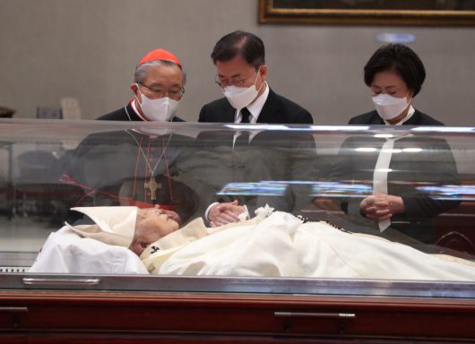 이날 오전 문 대통령과 부인 김정숙 여사는 정 추기경의 빈소를 찾아 애도했다.