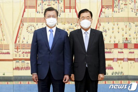 (서울=뉴스1) 이광호 기자 = 문재인 대통령이 15일 청와대에서 정의용 외교부 장관에게 임명장을 수여한 후 기념촬영을 하고 있다. 2021.2.15/뉴스1 |