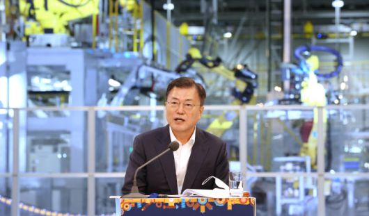 문재인 대통령이 29일 오후 광주광역시 광산구 광주글로벌모터스에서 열린 준공 기념행사에서 참석자들의 대화를 듣고 마무리 발언을 하고 있다. (사진=연합뉴스) |