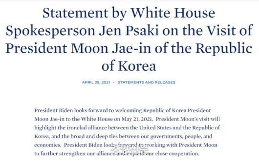 젠 사키 백악관 대변인은 이날 발표한 성명에서 “바이든 대통령은 5월 21일 문 대통령을 백악관에서 환영하길 고대한다”고 말했다.