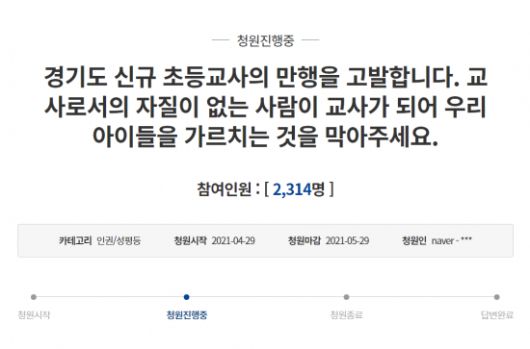 29일 청와대 국민청원 게시판에는 '경기도 신규 초등교사의 만행을 고발합니다. 교사의 자질이 없는 사람이 교사가 되어 우리 아이들을 가르치는 것을 막아주세요'라는 제목의 청원이 게재됐다.