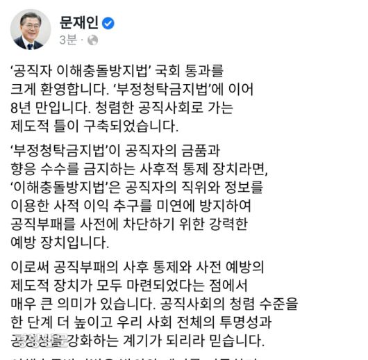 문 대통령은 이날 사회관계망서비스(SNS)에 글을 올려 “이 법이 시행되면 공직자의 부정한 부동산 투기는 물론 사적 이해관계를 활용한 거래나 계약 체결, 불공정 채용 등 공직부패의 싹을 원천적으로 차단하는 데 큰 역할을 하게 될 것”이라고 이같이 말했다.