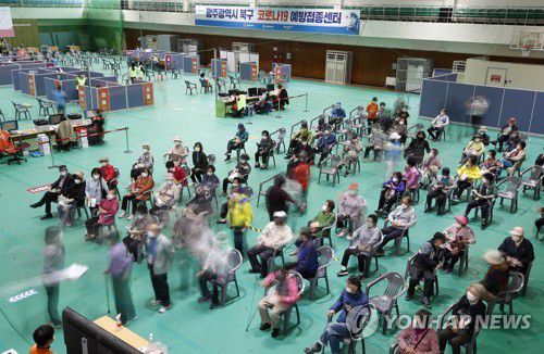 지난달 30일 오후 광주 북구 코로나19 예방접종센터에서 보건소 의료진이 75세 이상 어르신들에게 화이자 백신 접종을 하고 있다. 방역당국은 현재 75세 이상 고령층에게 접종 중인 화이자의 코로나19 백신 순차 도입 물량을 고려해 일시적으로 추가 예약을 자제해달라고 일선 접종 기관에 요청했다. [광주 북구청 제공. 재판매 및 DB 금지] |