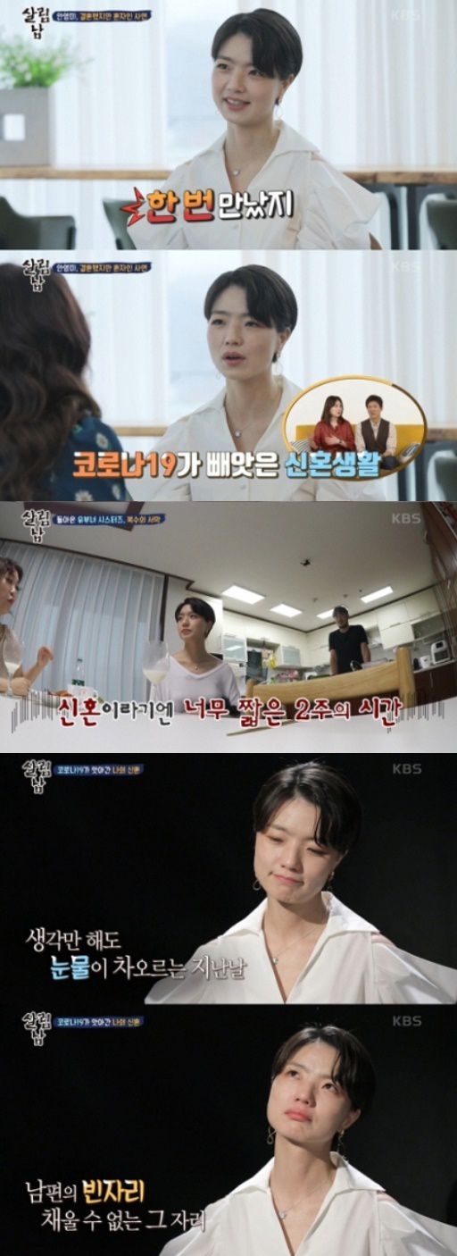 안영미는 “항상 외롭고 늘 보고 싶다. 작년에 너무 힘들었다. 내가 집에 가면 TV만 본다. 취미 생활도 없는 사람이라 TV만 보는데 뭘 봐도 재미가 없고, 뭘 먹어도 맛이 없다. 그냥 신혼살림들이 말이 신혼살림이지 다 필요가 없던 거였다. 그러면서 와 닿았던 거 같다”며 남편의 빈자리에 대한 안타까움을 나타냈다.