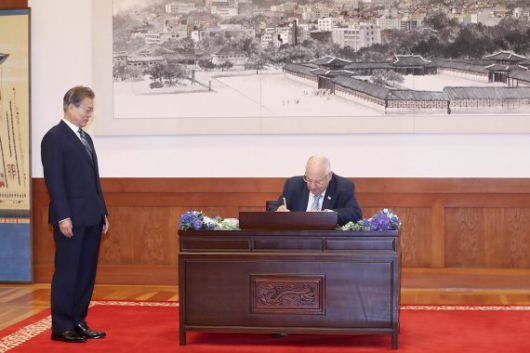 문재인 대통령이 지난 2019년 7월15일 청와대 본관에서 레우벤 리블린 이스라엘 대통령의 방명록 작성을 바라보고 있는 모습. (청와대 제공) 2019.7.15/뉴스1 /사진=뉴스1 |