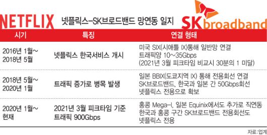 넷플릭스가 국내에 상륙한 뒤 3년 만에 데이터 통화량(트래픽)이 30배 정도 증가한 것으로 나타났다. 때문에 SK브로드밴드는 한국과 일본 간 50Gbps 전용회선을 넷플릭스 전용으로 확보하는 등 막대한 국제망 증설 투자를 하고 있지만, 넷플릭스는 ‘망이용대가를 낼 필요가 없다’며 한국 법원에 ‘채무부존재확인’ 소송을 제기했다.
