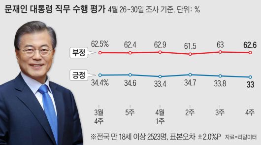 리얼미터가 YTN 의뢰로 지난달 26~30일 전국 18세 이상 2523명을 대상으로 조사한 결과, 문 대통령의 국정수행 지지율(긍정평가)은 33.0%로 전주보다 0.8%포인트 하락했다. 그간 리얼미터 주간집계 조사 중 최저치는 4월 첫째주 33.4%였는데, 이보다 0.4%포인트 떨어진 수치다.