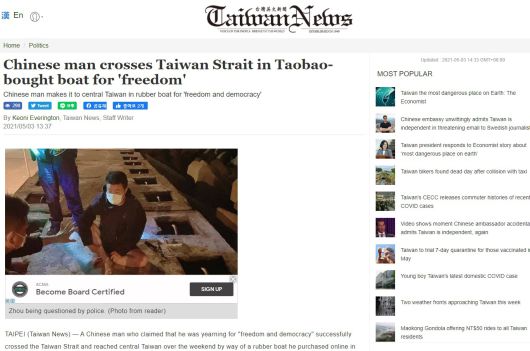 타오바오에서 산 고무 보트로 대만해협 건넌 중국 남성-타이완뉴스닷컴 캡처