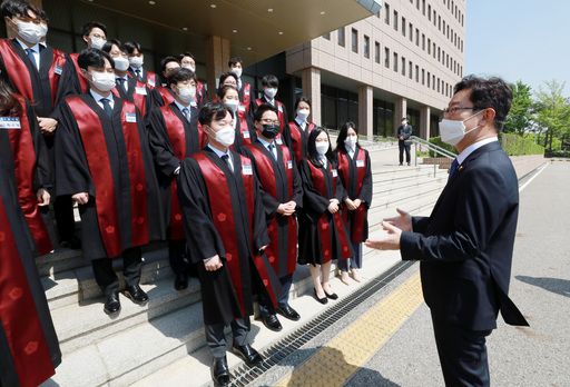 박범계 법무부 장관이 3일 법무부 정부과천청사에서 열린 신임 검사 임관식을 마친 후 신임 검사들에게 “세상이 달라진 만큼 검찰 역할도 달라져야 한다”고 당부하고 있다. 이날 신규 임용된 검사들은 제10회 변호사 시험 합격자 가운데 73명이다. 과천=서상배 선임기자 ⓒ 세상을 보는 눈, 세계일보