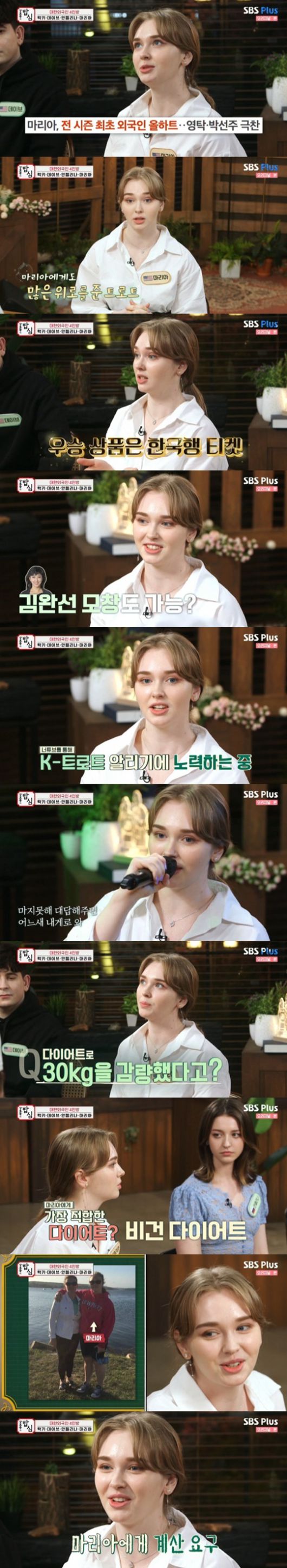 이어 마리아는 가수가 되기 위해 30㎏ 이상 감량했다고 고백해 모두를 놀라게 했다. 마리아는 "고등학교 때 살이 많이 쪄서 85㎏까지 나갔었다"라며 다이어트 비법으로 '비건다이어트'를 소개했다. 계란과 유제품을 전혀 먹지 않고 채식을 하는 다이어트라고. 이어 마리아의 과거 사진이 공개돼 시선을 모았다.