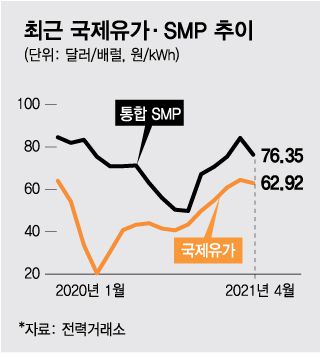 그런데 SMP가격은 예상보다 빠르게 반등하고 있다. 올해 1월 통합 SMP가격은 6개월만에 처음으로 70원을 넘었고 지난 3월에는 84.22원으로 높아졌다. 지난달에는 76.35원을 기록했다. 미세먼지 감축에 따라 LNG 발전 비중이 높아진 영향이 크나, 국제유가 상승도 영향을 미쳤다는 분석이다. 국제유가는 통상 3~4개월 시차를 두고 SMP에 반영된다.