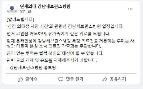 (서울=연합뉴스) 김잔디 기자 = 한강공원에서 실종됐다가 숨진 채 발견된 대학생 손정민(22) 씨의 친구가 강남세브란스병원 교수의 아들이라는 루머가 확산하자 병원 측이 "사실과 다르다"는 공식 입장을 냈다.