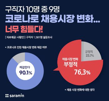 구인구직 매칭 플랫폼 사람인은 구직자 1581명을 대상으로 실시한 '코로나19 이후 채용시장 변화 체감 여부' 설문조사에서 체감하고 있다는 응답이 90.1%라고 4일 밝혔다. 체감하는 채용시장의 변화 1위는 '전체적인 채용규모 축소'(56.8%, 복수응답)였다. 다음으로 '화상 면접 등 언택트 채용 확산'(38.3%), '공개채용 축소와 수시채용 증가'(34.1%) 등이다.