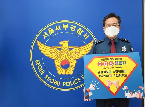 ▲ 이영우 서울 서부경찰서장은 아동학대 예방을 위한 'SOS 릴레이 챌린지'에 동참했다. 이 챌린지는 사회관계망서비스(SNS)에 '살펴보고, 찾아보고, 알려주고, 지켜주고'라는 구호를 공유하고 다음 참여자를 지명하는 방식으로 진행된다. 김미경 은평구청장 지명으로 참여한 이 서장은 다음 주자로 서울 은평경찰서장과 박주민 더불어민주당 의원을 지목했다. (서울=연합뉴스)