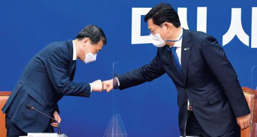 與대표와 금융위원장 - 4일 국회에서 열린 더불어민주당 부동산 현황 관계부처 보고에서 송영길(오른쪽) 대표가 은성수 금융위원장과 주먹 인사를 하고 있다. /국회사진기자단 |