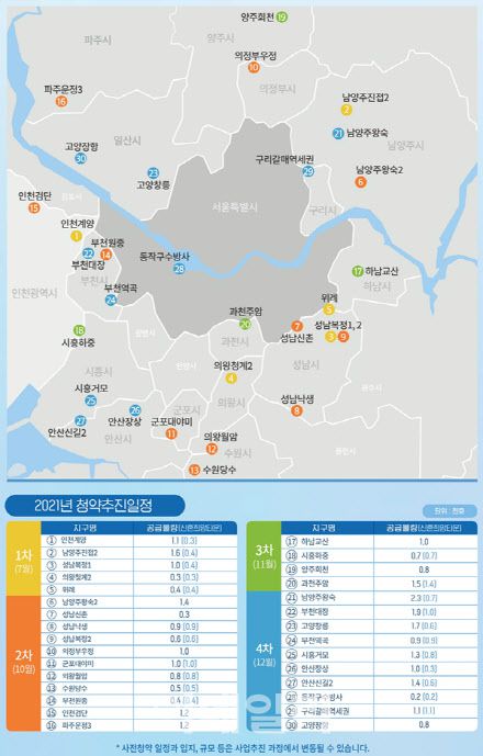 7월에는 3기 신도시인 인천 계양 1100가구를 비롯해 남양주진접2지구 1600가구, 위례신도시 400가구, 성남복정지구 1000가구, 의왕청계2 300가구 등 5개 지구가 가장 먼저 사전청약에 나선다. 대상지 모두 분양가상한제가 적용되기 때문에 주변 시세의 70~80%가 될 것으로 전망된다.