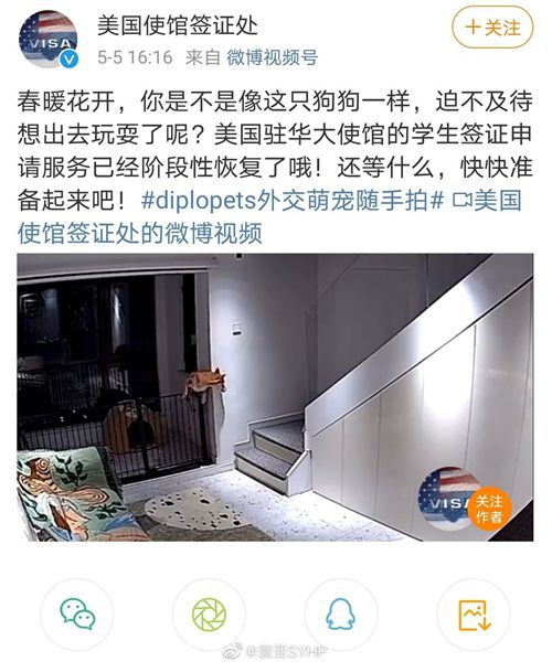 이 게시물은 주중 미국대사관이 중국인 학생을 대상으로 비자 발급을 재개한 바로 다음 날 올라왔다. 웨이보에 올라온 글과 영상에 나오는 개는 비자 발급을 고대하는 중국 유학생을 빗댄 것으로 해석됐다.