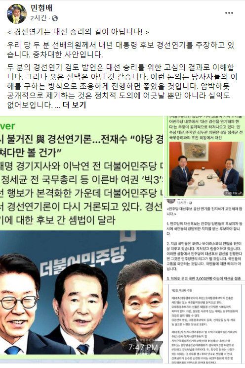 전날 전재수·김두관 두 의원은 각각 페이스북과 언론 보도를 통해 대선 경선 일정을 미뤄야 할 필요성을 제기했다. 핵심 친문 그룹인 ‘부엉이모임’의 멤버였던 전 의원은 현재 이광재 의원을 돕고 있으며, 김 의원은 직접 대선에 출마할 뜻을 가지고 있는 것으로 전해진다. 민 의원은 지난 1월 이 지사와 정치적인 입장이 같다며 공개 지지를 밝힌 바 있다.