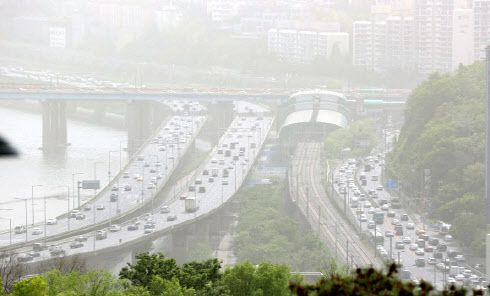 7일 오후 서울 응봉산에서 바라본 강변북로 일대가 황사에 뒤덮여 있다. (사진=연합뉴스) |
