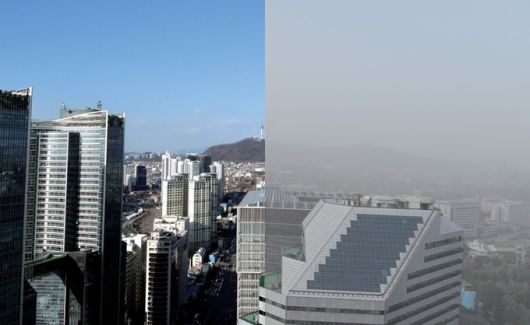 서울 등 10개 시·도에 ‘황사 위기경보’가 발령된 7일, 서울 용산구 세계일보에서 바라본 남산서울타워 방향 풍경(오른쪽 사진). 맑은 날에는 왼쪽 사진처럼 남산서울타워 주변까지 뚜렷이 보이지만 이날은 남산 자체가 잘 보이지 않았다. 5월 중 내륙에 황사경보가 발표된 것은 2008년 5월 30일 이후 13년 만이고, 이날 황사에 따른 미세먼지 경보가 발령돼 서울·인천·수원·광주에서 열릴 예정이던 프로야구 4경기가 처음으로 한꺼번에 취소됐다. 어버이날인 8일에도 전국 대부분 지역이 황사 영향권에 들고 미세먼지 농도는 ‘매우 나쁨’ 상태일 것으로 예보됐다.