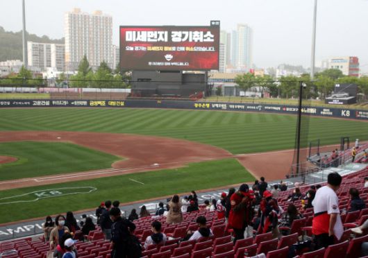 KBO는 잠실 LG 트윈스-한화 이글스, 인천 SSG 랜더스-키움 히어로즈, 수원 kt wiz-NC 다이노스, 광주 KIA 타이거즈-두산 베어스의 더블헤더 1차전을 미세먼지 문제로 취소했다.