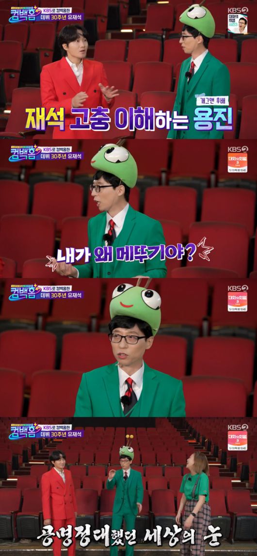 이날 메뚜기 탈을 타고 등장한 유재석은 "버라이어티 진출을 메뚜기 탈을 쓰고 했다. 당시 KBS 예능국에서 메뚜기 탈을 주면서 '할 거면 하고 말 거면 말아라'라고 했다"고 밝혔다.