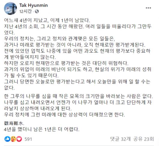 글의 말미에 그는 "관해난수(觀海難水·바다를 본 사람은 물을 함부로 말하지 않는다)"라는 맹자의 인용구를 덧붙이며 "4년을 했으니 남은 1년은 더 어렵다"고 자신의 심경을 밝혔다.