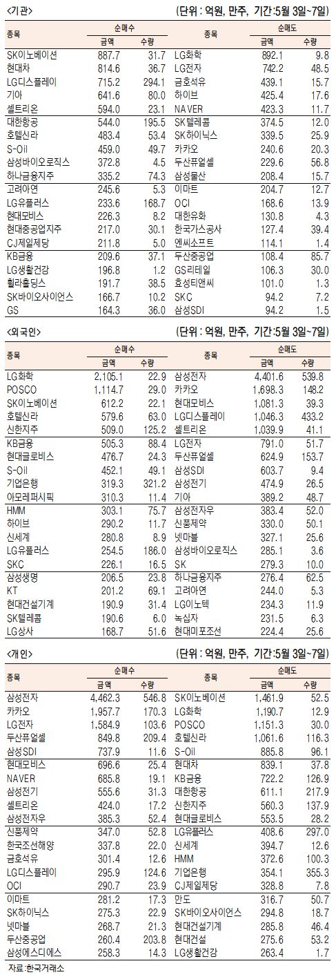 [표]주간 유가증권 기관·외국인·개인 순매수·도 상위종목(5월 3일~7일)