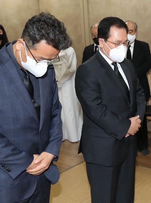 (서울=뉴스1) 사진공동취재단 = 유영민 대통령 비서실장과 이철희 정무수석이 9일 서울 광진구 건국대학교병원 장례식장에 마련된 故 이한동 전 국무총리 빈소에서 조문을 하고 있다. 2021.5.9/뉴스1 /사진=뉴스1화상 |
