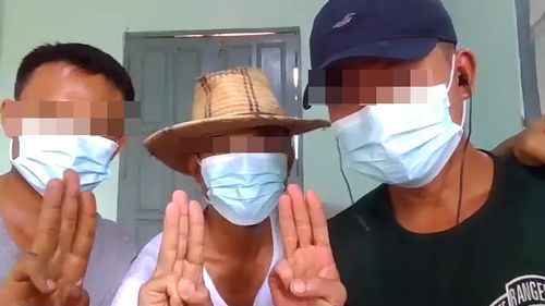카렌반군캠프에서 화상 인터뷰 중인 미얀마 시민들이 저항의 상징 '세손가락 경례'를 하고 있다. 2021.5.8 [양곤=연합뉴스 이정호 통신원] |