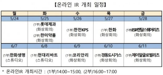 이번 온라인 IR은 오는 25일 롯데제과 및 한미약품을 시작으로 6월 11일까지 진행되며, 올해 1분기 경영실적 발표 및 질의응답 등이 이루어질 예정이다.