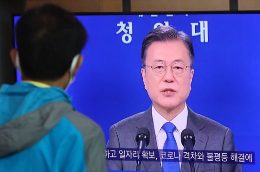 문재인 대통령이 취임 4주년 특별연설을 한 10일 오전 서울 중구 서울역 대합실에서 한 시민이 문 대통령의 연설을 시청하고 있다. |