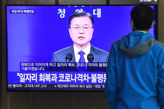 10일 오전 서울 중구 서울역에서 시민들이 문재인 대통령의 취임 4주년 특별연설을 TV로 시청하고 있다. |