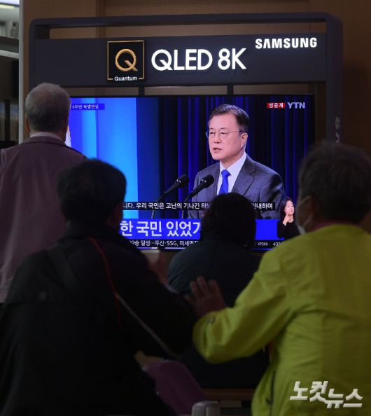 10일 서울역 대합실에서 시민들이 문재인 대통령 취임 4주년 특별연설을 시청하고 있다. 이한형 기자 |
