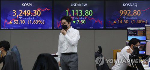 한국거래소에 따르면 이날 코스피는 전 거래일보다 52.10포인트(1.63%) 오른 3,249.30에 거래를 마쳤다.
