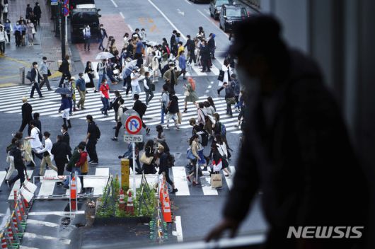 [도쿄=AP/뉴시스]지난달 29일 일본 도쿄 시부야 교차로를 한 남성이 창문 너머로 바라보고 있다. 2021.05.10. |