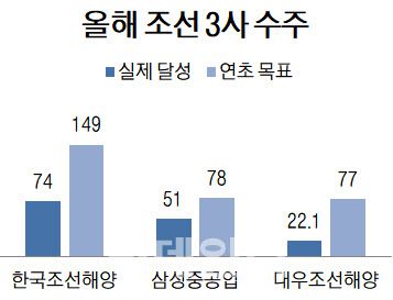 10일 업계에 따르면 현재 한국조선해양(009540)·삼성중공업(010140)·대우조선해양(042660) 등 대형 조선 3사는 현재 총 147억1000만달러를 수주해 연초 수주 목표 달성률이 48.4%를 기록했다. 각사별 목표 달성률은 삼성중공업이 65.4%로 가장 높고 한국조선해양 49.7%, 대우조선해양 28.7% 등이 그 뒤를 이었다.