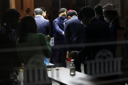 송영길 더불어민주당 대표가 10일 오후 서울 여의도 국회에서 열린 비공개 의원총회에 참석하며 우원식 의원과 인사를 나누고 있다. (공동취재사진) |