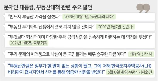 다만 투기 수요를 적극 차단해 실수요자를 보호하는 현재의 부동산정책 기조 자체는 임기가 끝날 때까지 계속될 것으로 보인다. 문 대통령은 “날로 심각해지는 자산 불평등을 개선하기 위해서라도 투기를 철저히 차단하겠다”고 언급하기도 했다. 특히 땅 투기 의혹의 중심에 선 한국토지주택공사(LH) 사태에 대해선 “투명하고 공정한 부동산 거래 질서 확립과 불법 투기의 근원을 차단하기 위한 근본적인 제도 개혁을 완결짓겠다”고 강조했다.