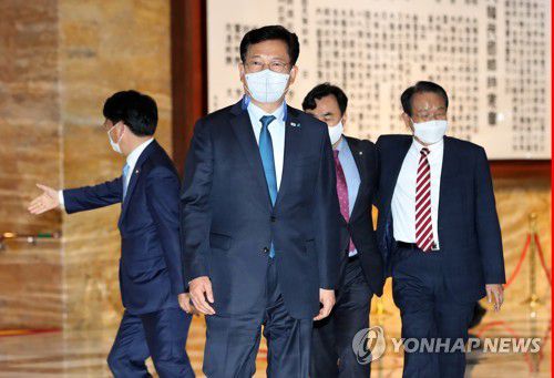 비공개 의원총회 참석하는 민주당 송영길 대표 |